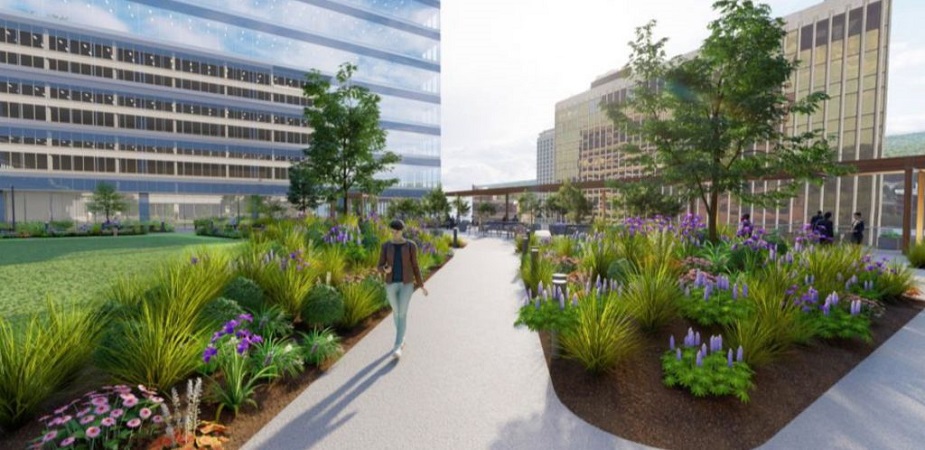 Balke Brown Transwestern has teamed up with NAI Desco to market a new property currently under construction in Clayton, Missouri, that will incorporate a private garden terrace on the parking garage rooftop between two towers. In addition to adding tenant amenity space, rooftop gardens provide temporary stormwater retention, reduce solar heat absorption and can foster habitat for pollinators and other local species.
